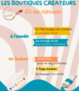 Boutique créateurs Vous pouvez me retrouver dans plusieurs boutiques de créateurs des Pyrénées Orientales, où nous pourrons nous croiser au gré de mes permanences. J’y expose des aquarelles originales mais aussi des reproductions de certains dessins, des mini carnets accordéon … lire plus